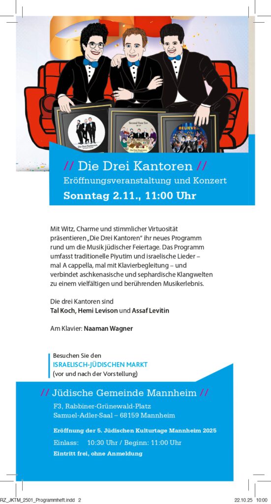 Sonntag 02.11., 11:00 Uhr Eröffnungsveranstaltung und Konzert: Die Drei KantorenEintritt frei, ohne Anmeldung