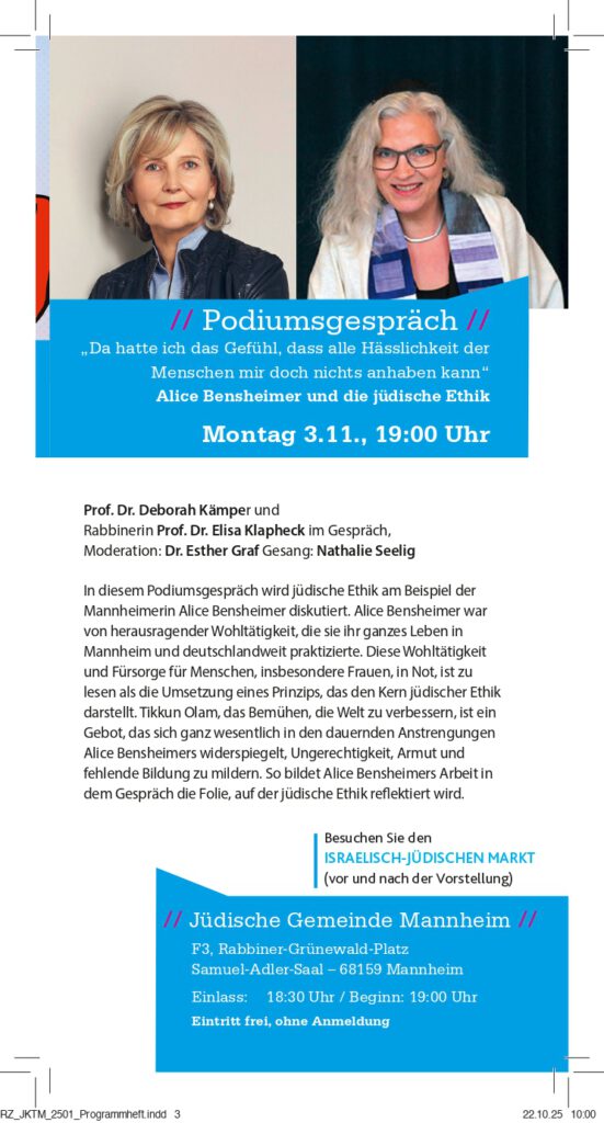 Montag 03.11., 19:00 Uhr Podiumsgespräch: „Da hatte ich das Gefühl,dass alle Hässlichkeit der Menschen mir doch nichts anhaben kann“Alice Bensheimer und die jüdische Ethik: Prof. Dr. Deborah Kämper undRabbinerin Prof. Dr. Elisa Klapheck im GesprächModeration Dr. Esther Graf / Gesang: Nathalie SeeligEintritt frei, ohne Anmeldung