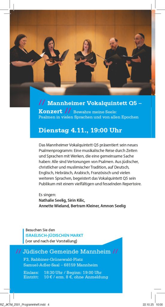 Dienstag 04.11., 19:00 Uhr Konzert des Mannheimer Vokalquintetts Q5: Bewahre meine SeelePsalmen in vielen Sprachen und von allen EpochenEintritt: € 10,– erm. € 8,–, ohne Anmeldung