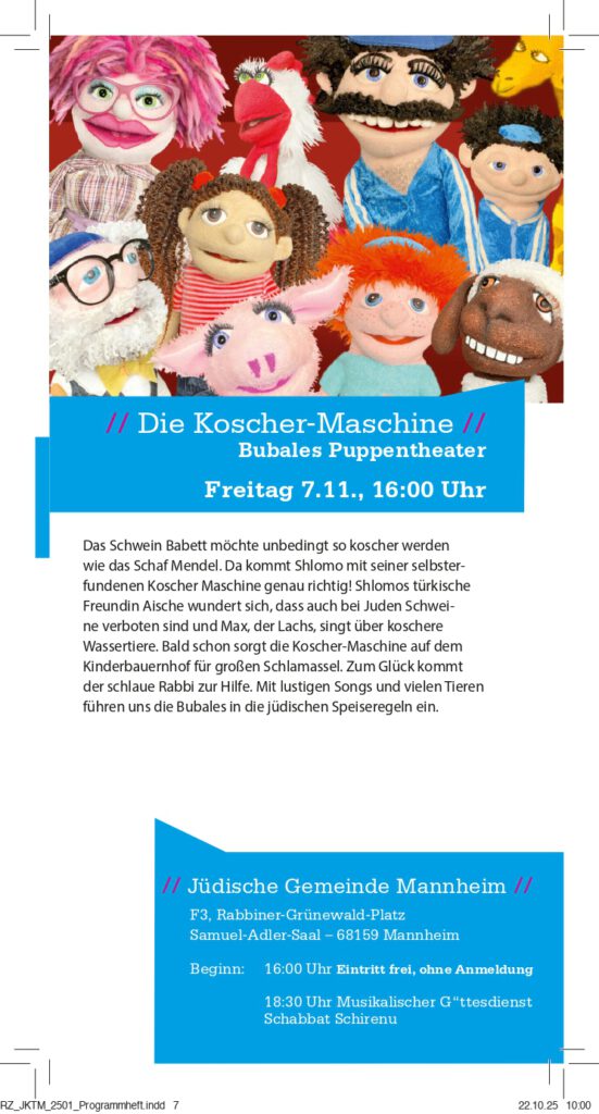 Freitag 07.11., 16:00 Uhr Bubales Puppentheater: Die Koscher-MaschineEintritt frei, ohne Anmeldung18.30 Uhr Musikalischer G“ttesdienst – Schabbat Schirenu